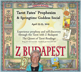 - April 23-25: Priestess Training: Divination with Z Budapest, Woodstock, NY - Wise Woman Center $500 all inclusive (instruction, rituals, rustic lodging, vegetarian meals). This year Z Budapest rolls up her sleeves to teach something she’s never taught for us before … the importance of Divination in Women’s Spirituality! Z calls it a Tarot Social Intensive weekend; a new and inspired way of consulting the Fates and each other as priestesses. It matters not whether you are an advanced seeker or a beginner with a fresh new deck, this Goddess weekend is devoted to study and first-hand experiences of the Tarot’s wisdoms.